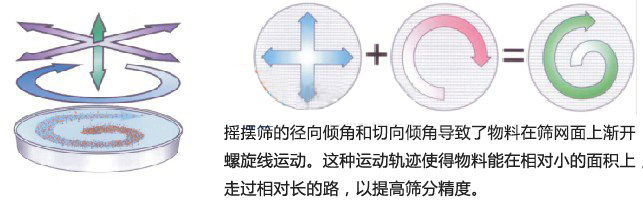 物料在圓形搖擺篩篩面上從中心到外圍擴散,物料均勻在篩面上做跳躍旋轉的螺旋運動,無法篩分到下層的物料會在該層面的出料口排出,直至所有物料篩分完畢。工作任務結束。